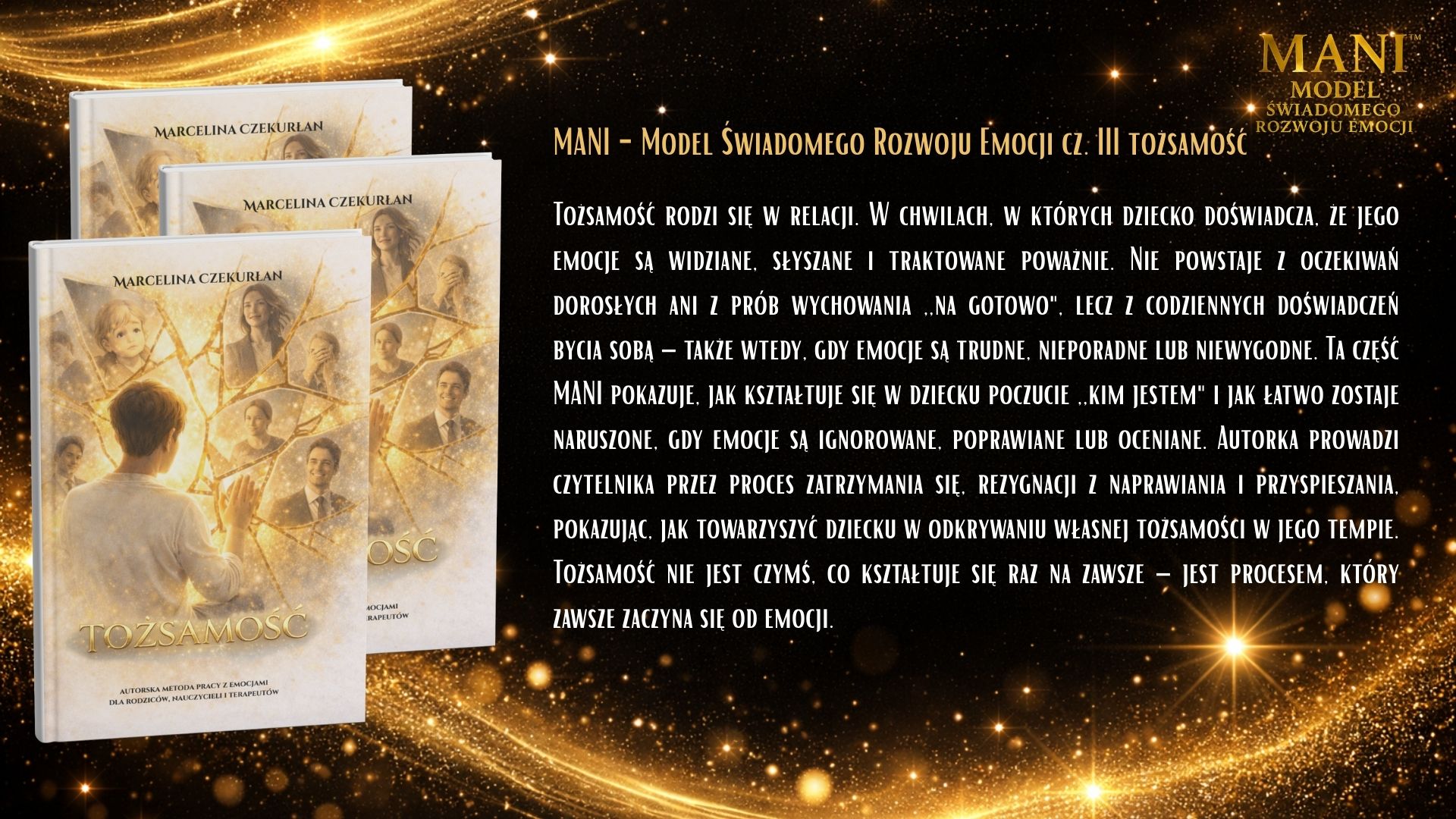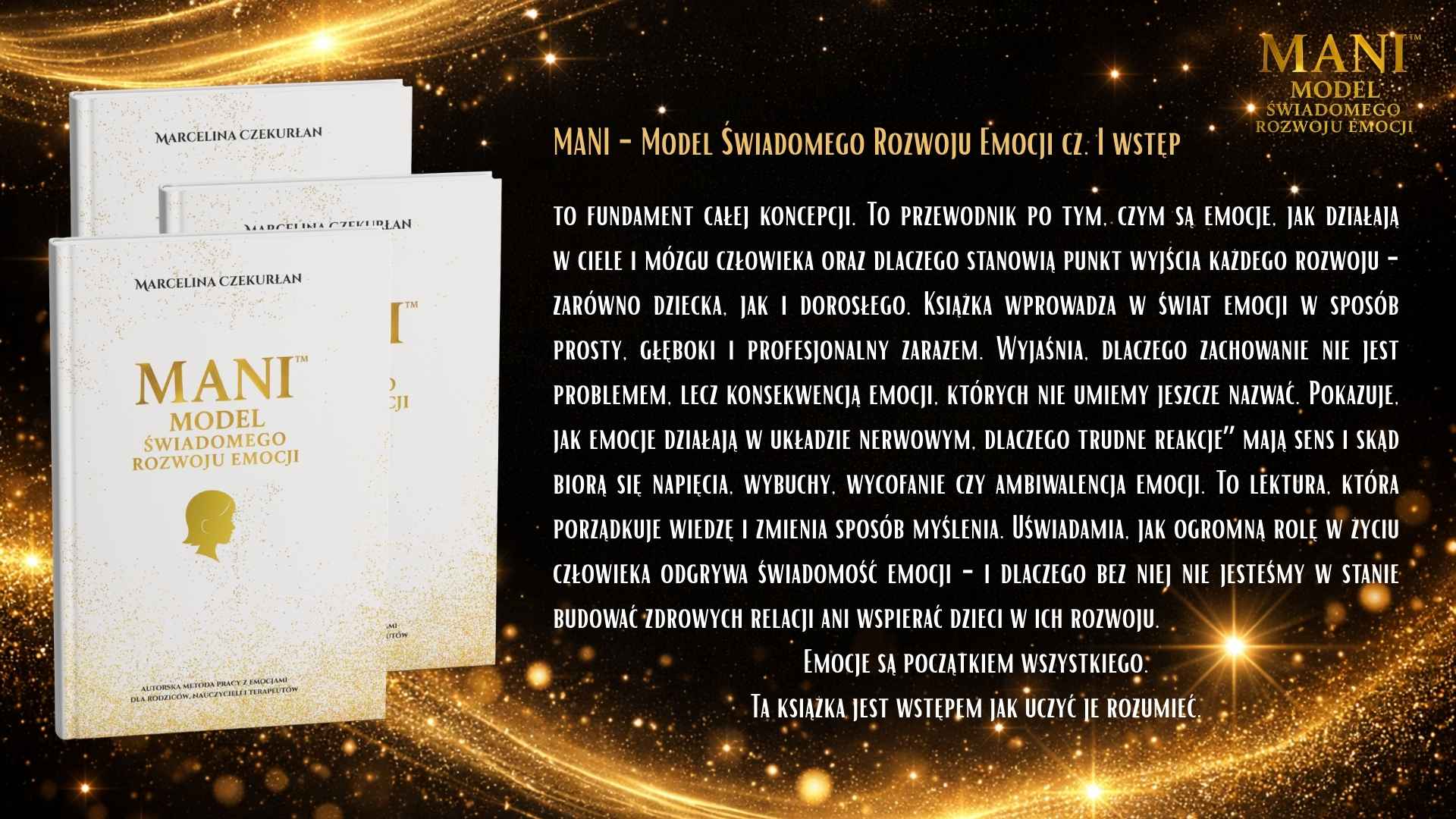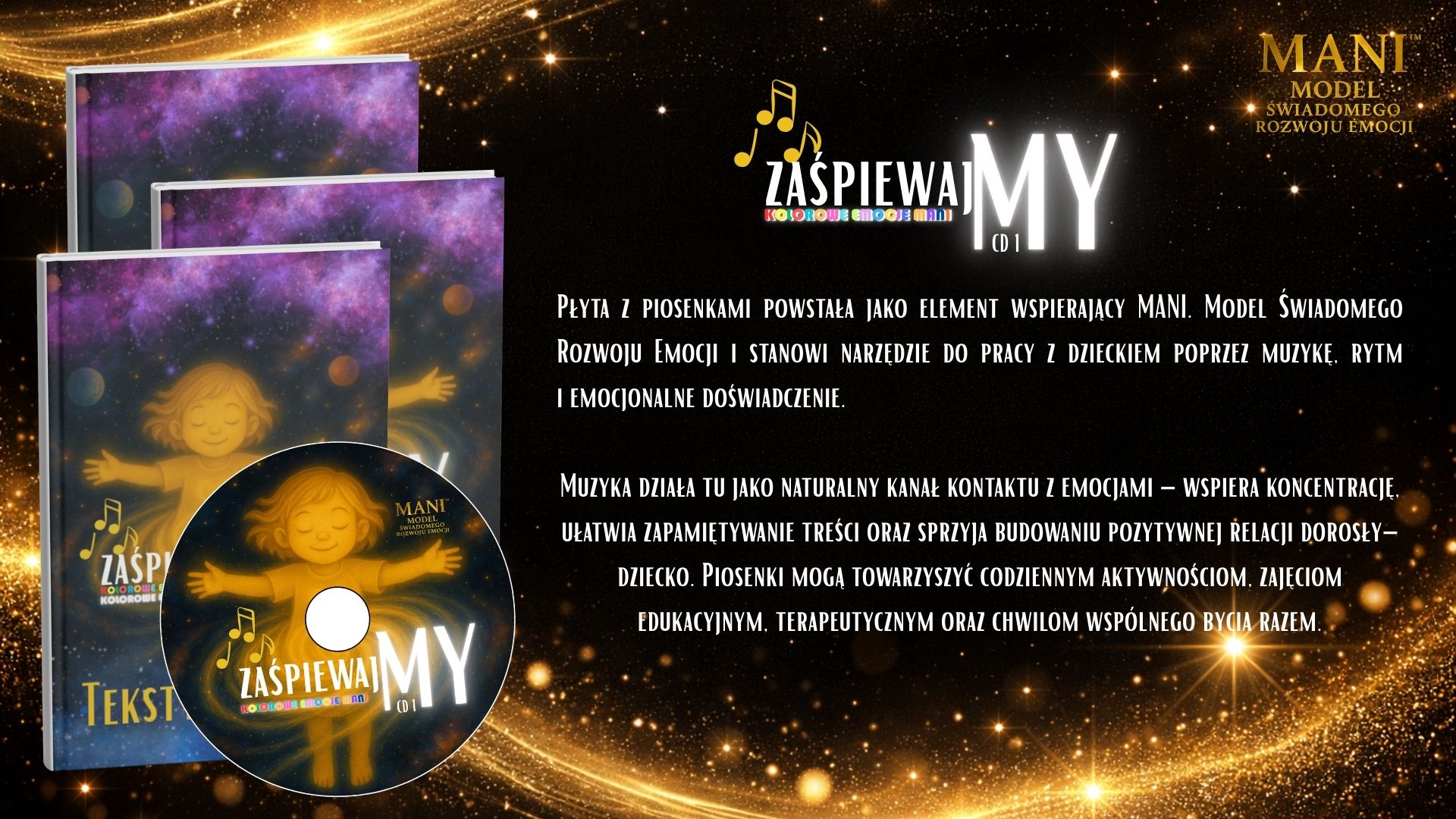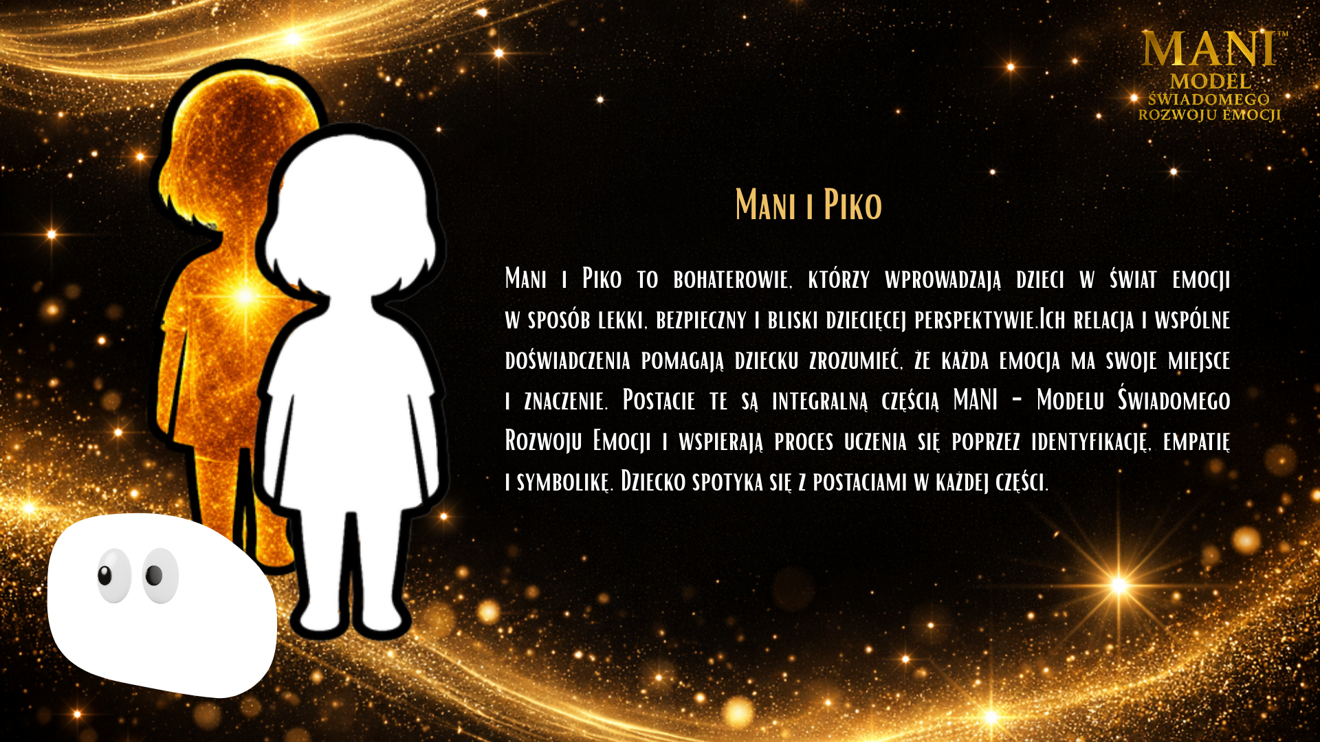 Model MANI to spójny system pracy z emocjami i tożsamością dziecka, oparty na relacji, uważności i wspólnym doświadczaniu. Nie jest jedną książką ani jednym ćwiczeniem – to zestaw narzędzi, które prowadzą dziecko i dorosłego ramię w ramię przez proces rozwoju emocjonalnego. W skład narzędzi MANI wchodzą książki dla dzieci i dorosłych, materiały wspierające pracę z emocjami, postacie MANI i PIKO oraz piosenki, które pomagają integrować doświadczenia poprzez ciało, ruch i dźwięk. Każdy element pełni inną funkcję, ale wszystkie łączy jedno: budowanie bezpiecznej przestrzeni do rozmowy, refleksji i bycia sobą. Książki dla dzieci pomagają rozpoznawać siebie, swoje emocje i potrzeby w naturalnym, nienarzucającym tempie. Książki dla dorosłych wspierają proces zatrzymania się, zrozumienia własnych reakcji i świadomego towarzyszenia dziecku. Postacie MANI i PIKO ułatwiają dzieciom identyfikację, oswajanie emocji i wejście w świat wewnętrznych przeżyć. Piosenki wzmacniają proces integracji – pomagają poczuć, zapamiętać i przeżyć emocje całym sobą. Narzędzia MANI można stosować w domu, przedszkolu, szkole i terapii. Nie wymagają „gotowych odpowiedzi” ani idealnych kompetencji. Są zaproszeniem do wspólnej drogi – w której dorosły nie prowadzi dziecka przed sobą, lecz idzie obok, ucząc się razem z nim.