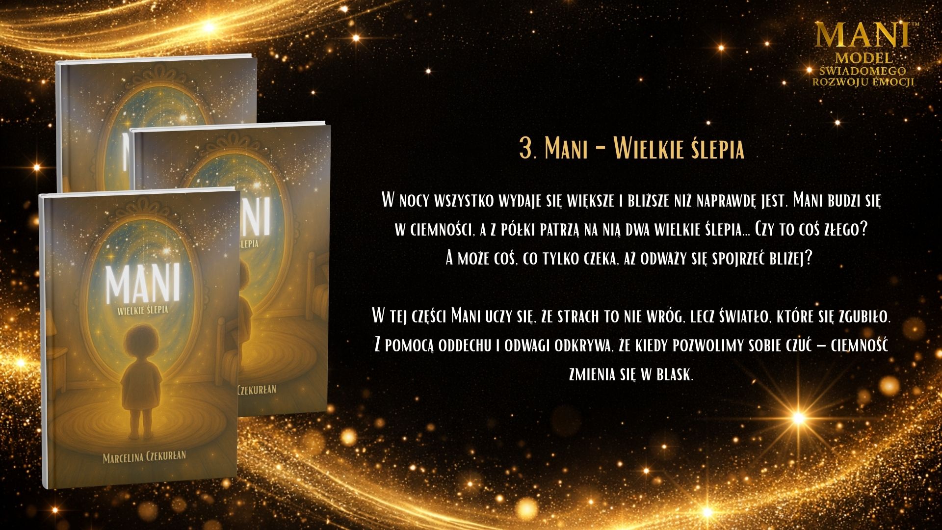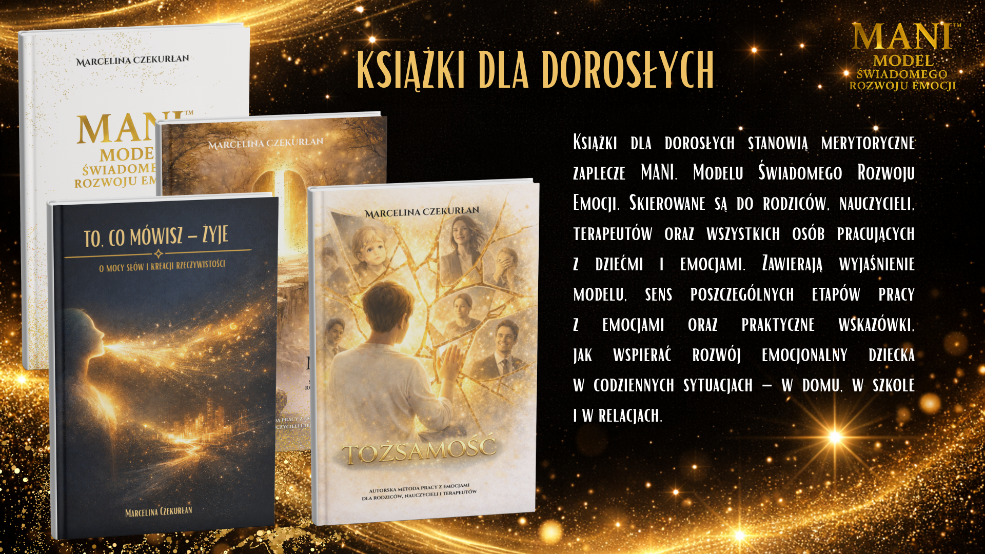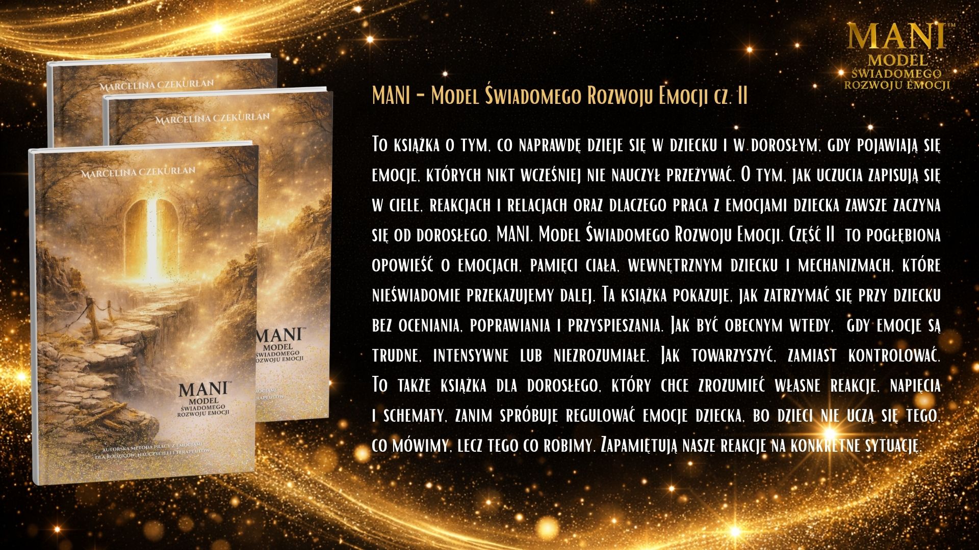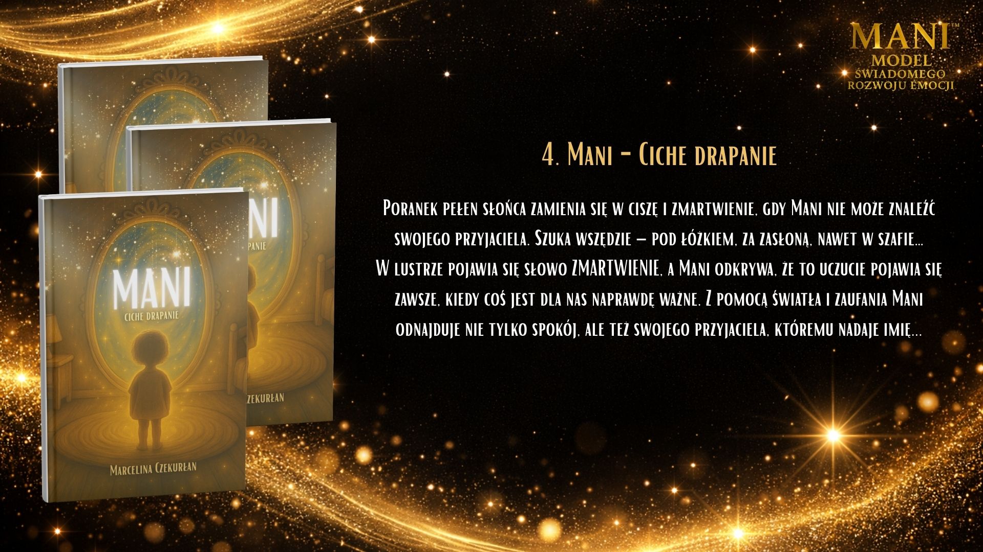 Model MANI to spójny system pracy z emocjami i tożsamością dziecka, oparty na relacji, uważności i wspólnym doświadczaniu. Nie jest jedną książką ani jednym ćwiczeniem – to zestaw narzędzi, które prowadzą dziecko i dorosłego ramię w ramię przez proces rozwoju emocjonalnego. W skład narzędzi MANI wchodzą książki dla dzieci i dorosłych, materiały wspierające pracę z emocjami, postacie MANI i PIKO oraz piosenki, które pomagają integrować doświadczenia poprzez ciało, ruch i dźwięk. Każdy element pełni inną funkcję, ale wszystkie łączy jedno: budowanie bezpiecznej przestrzeni do rozmowy, refleksji i bycia sobą. Książki dla dzieci pomagają rozpoznawać siebie, swoje emocje i potrzeby w naturalnym, nienarzucającym tempie. Książki dla dorosłych wspierają proces zatrzymania się, zrozumienia własnych reakcji i świadomego towarzyszenia dziecku. Postacie MANI i PIKO ułatwiają dzieciom identyfikację, oswajanie emocji i wejście w świat wewnętrznych przeżyć. Piosenki wzmacniają proces integracji – pomagają poczuć, zapamiętać i przeżyć emocje całym sobą. Narzędzia MANI można stosować w domu, przedszkolu, szkole i terapii. Nie wymagają „gotowych odpowiedzi” ani idealnych kompetencji. Są zaproszeniem do wspólnej drogi – w której dorosły nie prowadzi dziecka przed sobą, lecz idzie obok, ucząc się razem z nim.